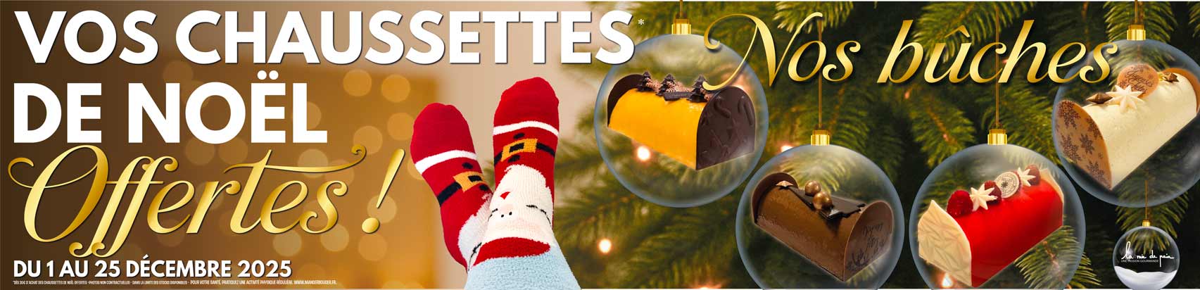 Cette année, à La Mie de Pain, on booste la magie des fêtes ! Dès 30 € d’achat, repartez avec vos chaussettes de Noël : un petit cadeau fun et tendance, prêt à être enfilé… ou accroché à votre sapin grâce à son packaging ludique en forme de boule de Noël. Une attention pleine d’esprit festif pour égayer vos achats et vous remercier pour votre fidélité !